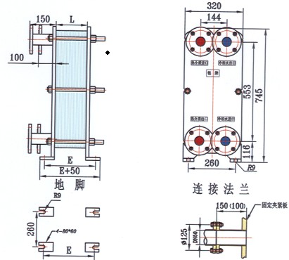 框架包括一个固定压紧板和一个活动压紧板,由上导杆与下导杆支承,在另‘端有一支柱。压制成的波纹板片悬挂在两板之间的上导杆上,移动活动压紧板将板片组压紧,再用一组夹紧螺柱将固定压紧板和活动压紧板夹紧至一定尺寸。两种介质经固定(或活动)压紧板上法兰孔流入由波纹板片组成的各自通道,热交换后介质再由固定(或活动)压紧板上的法兰孔流出。同定压紧板、活动压紧板、支柱及导杆均为低碳钢。考虑到用户的多种使用要求,框架设计有多种型式,主要有双支撑框架式和常用的落地式等,也可根据用户的要求更改框架的型式。